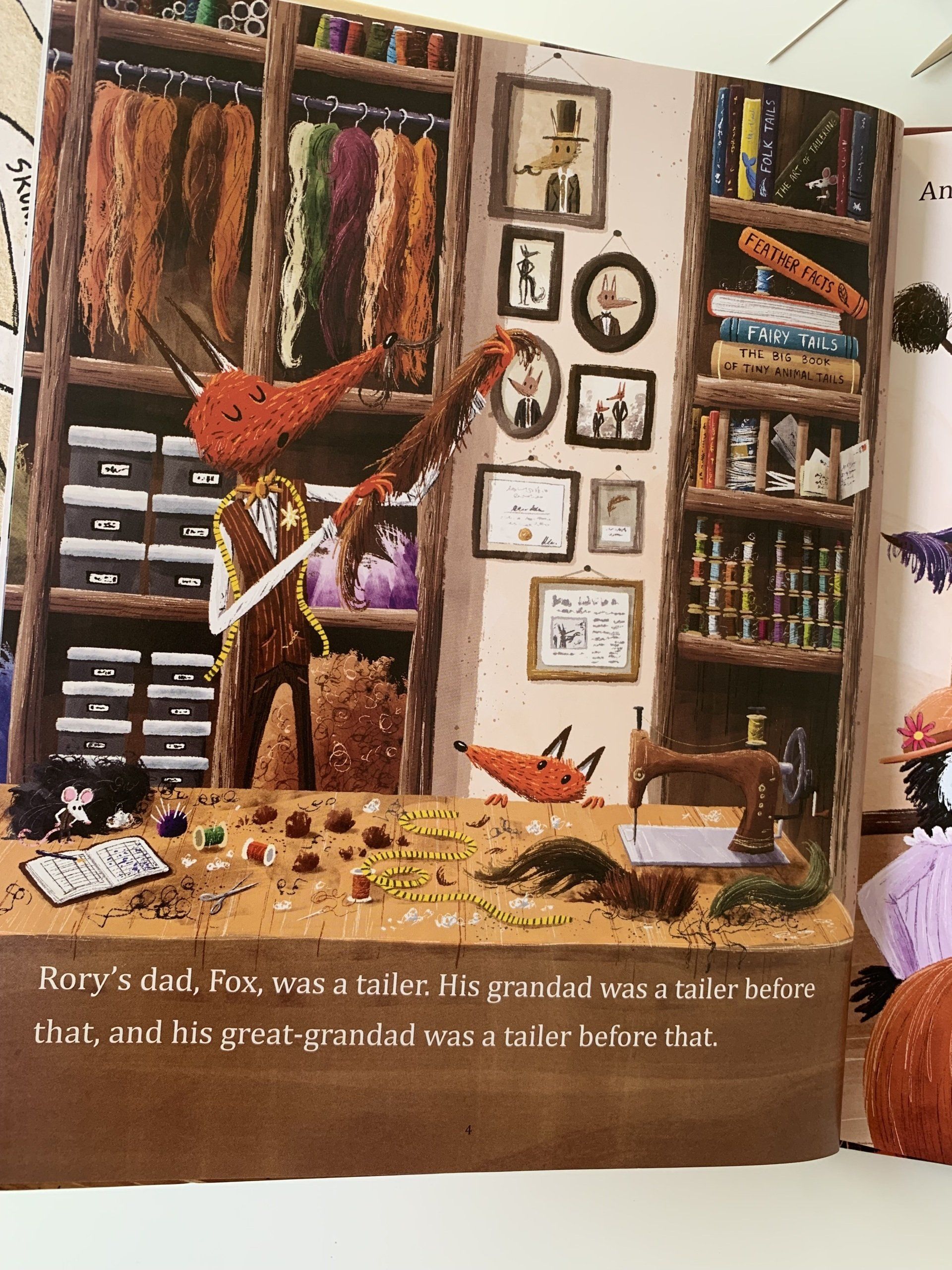 Rory’s Dad is a ‘tailer’ (notice the lovely play on words). Measuring, cutting and creating tails for animals has been the family’s profession for years so rules have been passed down through the generations. ‘Wedding tails have to be 7 feet 3 3/4 inches long and formal tails need to be 7/8 inch off the floor’, are the mantras that Rory hears continually. Creatures come from far and wide to have their tails made to measure by Rory’s Dad for all occasions including a first day at school tail! Now Paddy is a visual storyteller and the details in the illustrations through the pages where Rory helps his Dad in his shop are brim full of extra details that children will delight in.